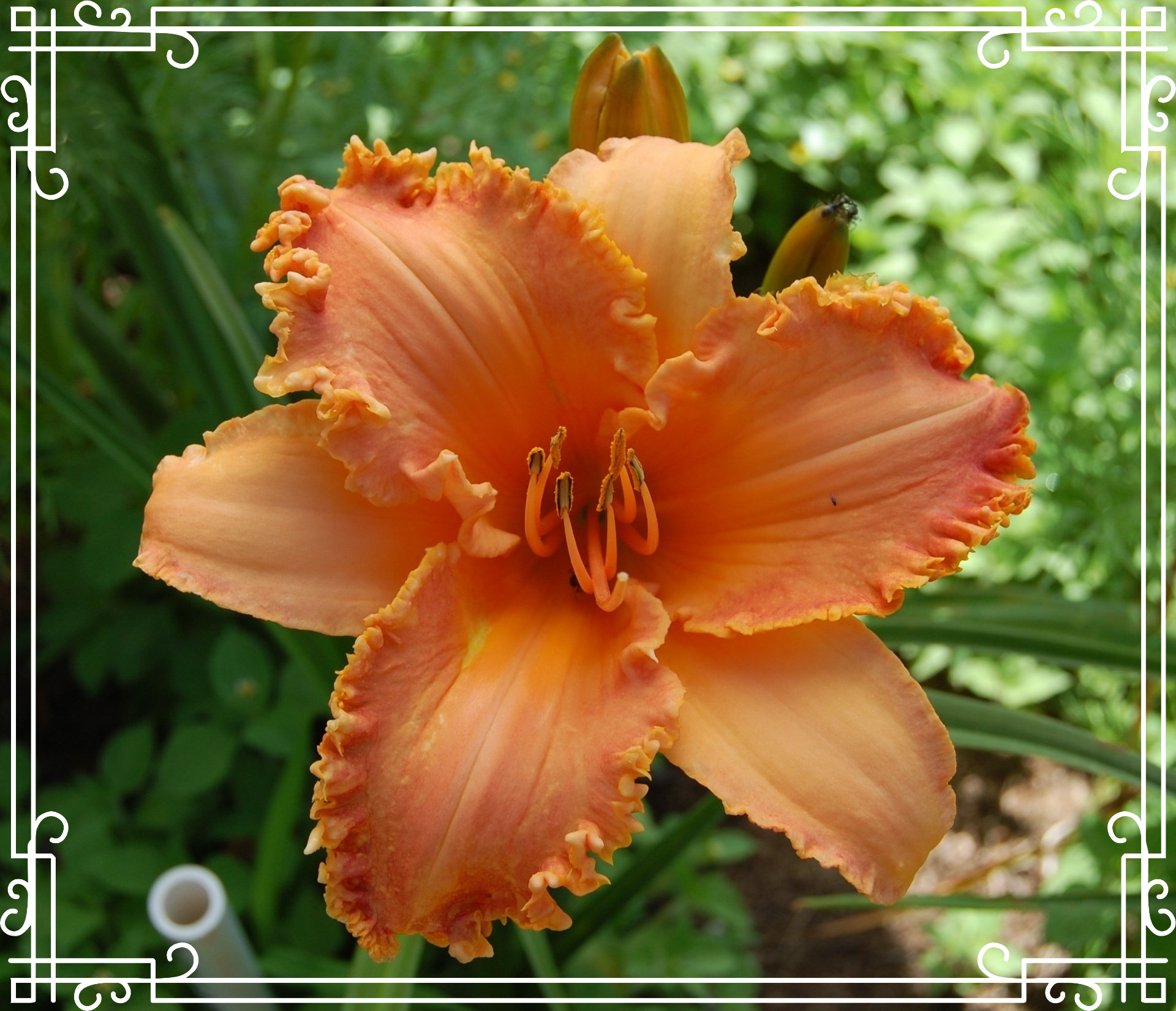 Dark apricot, faint halo, melon throat, tightly ruffled